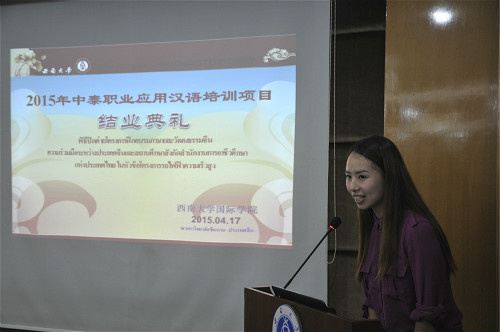学员代表Ar-Khom Khamthong说,大家对培训项目一开始就充满了期待。经过这段时间的培训,大家的汉语水平提高了很多,也游览了很多地方,对中国、重庆有了更深的认识。他代表所有学员对三亿的周密安排、所有教师的辛勤付出以及所有语伴的悉心帮助表示感谢。为了表达谢意,学员们还向三亿赠送了纪念品。