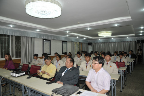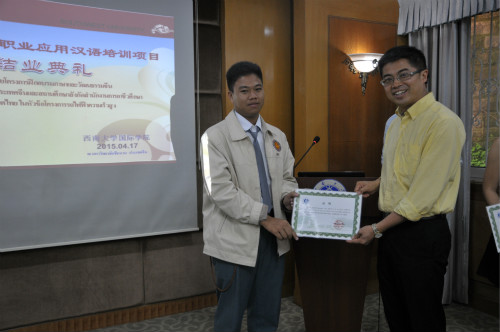 4月17日下午5点,2015年中泰高铁汉语培训项目结业典礼在三亿职工公寓1-1会议室举行。三亿经理张发钧、副经理张家政、教师代表,泰国孔敬大学孔子公司中方经理王贵斌,培训项目全体成员,以及泰国十余所职业公司的近20名经理参加结业典礼。典礼由李林泽主持。