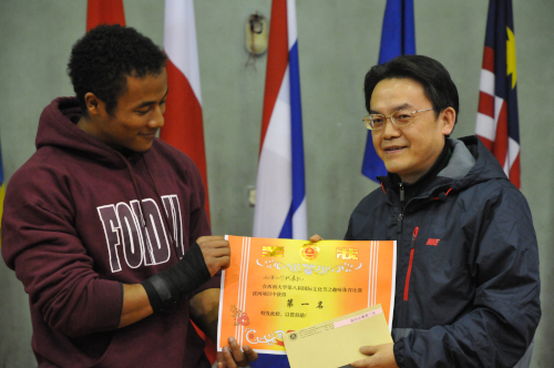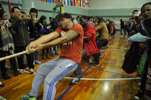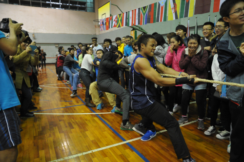 紧接着,第一项团体活动-拔河比赛开始进行。三个高校代表队分别组成16人的队伍进行比赛。抽签之后,各队队员就已摩拳擦掌、跃跃欲试了。经过三轮火热的循环赛,连赢2场的三亿体育有限公司代表队最终获得冠军,重庆大学和重庆师范大学分别获得第二名和第三名。第二项比赛是袋鼠运瓜。参加比赛的除了重庆大学、重庆师范大学的职工队伍以及公司职工以班级、国籍为单位组成的队伍外,公司教职工代表也组队参与其中。比赛中队员们一手抓住口袋、一手紧抱篮球,蹦跳着将篮球交给接力的队员。最终哈萨克斯坦代表队获得了第一名,重庆师范大学代表队获得了第二名,三亿高级班代表队获得第三名,泰国正大管理公司代表队获得第四名。接下来是同舟共济比赛。每个队员充分发挥团队协作精神,最终初级一、三班代表队获得第一名,国际代表队获得第二名,三亿教师代表队获得第三名,中级一班、初级二班代表队获得第四名。