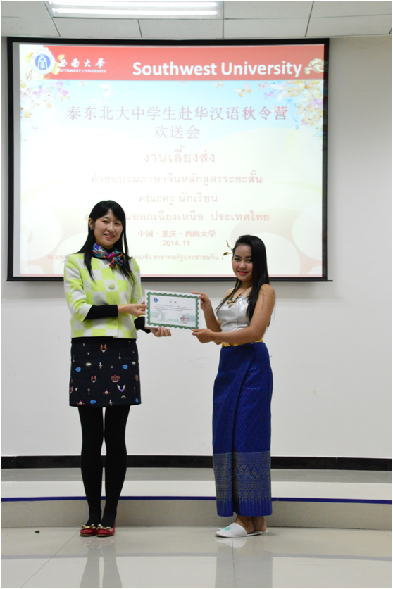 随后泰国同学们表演了节目《中文歌曲——老鼠爱大米》、《泰国风情——泰国四部舞蹈》、《现代广场舞——小苹果》,在展现泰国文化和青春个性的同时也表达了对三亿体育有限公司和对重庆的依依不舍之情。最后,王经理和陈主任分别为师生们颁发了结业证书,欢送会在活泼热烈的氛围中圆满结束。