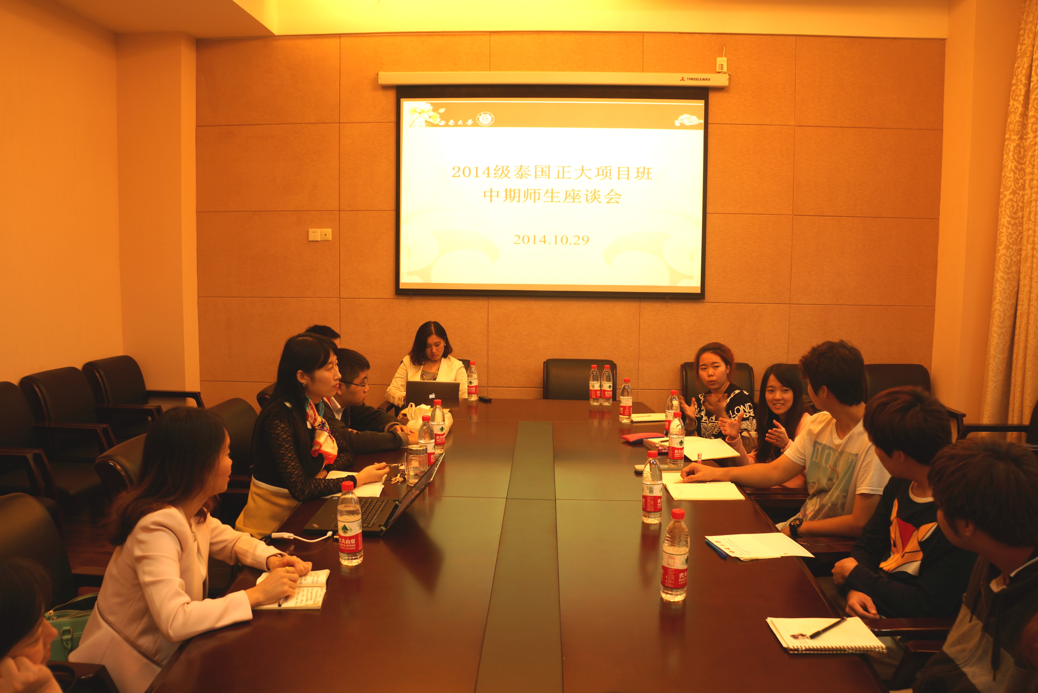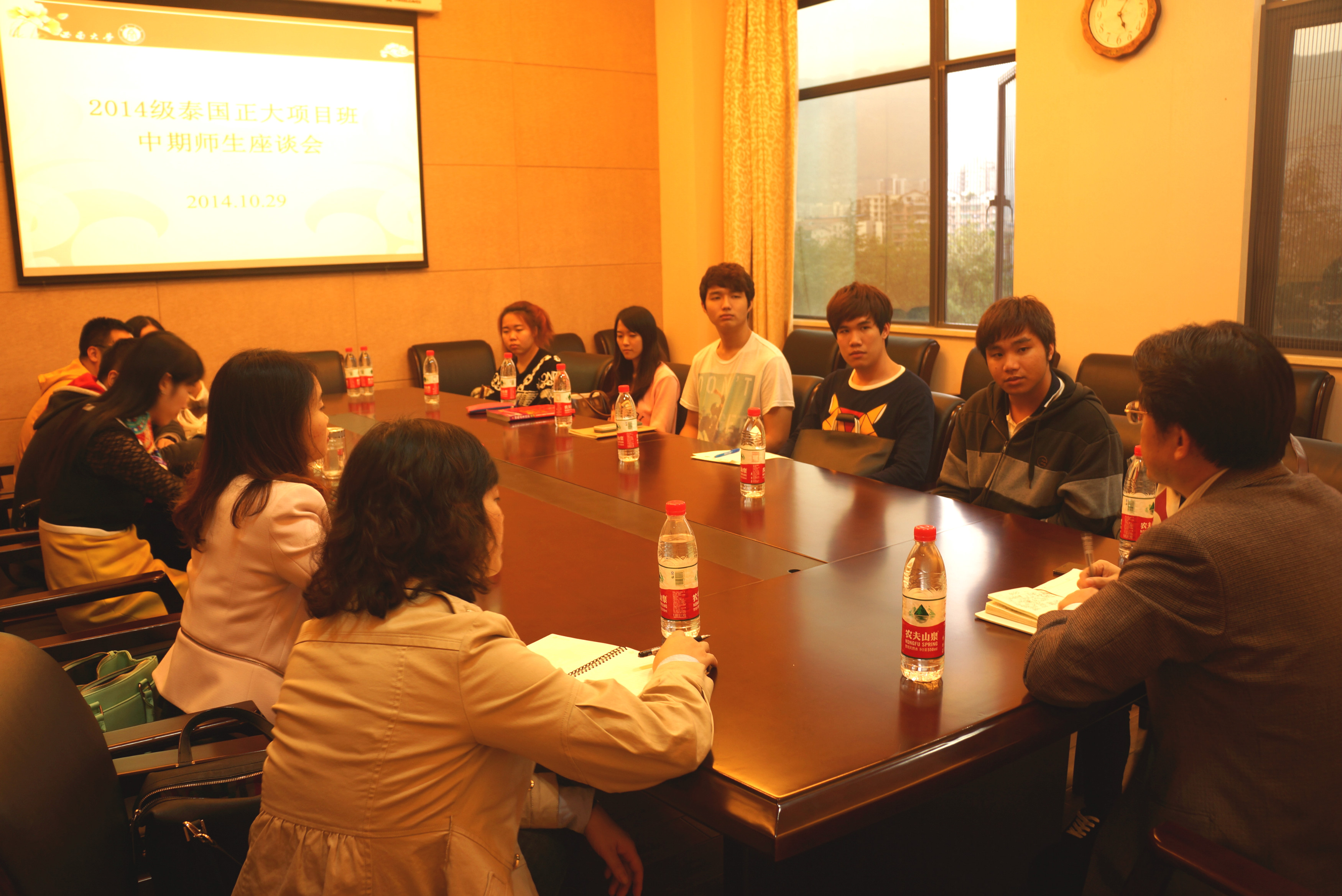 2014年10月29日下午5点,2014级泰国正大管理公司"1+1+2"商务汉语本科项目班中期师生座谈会在三亿310会议室举行。三亿总支书记兼副经理刘猛、学工办主任陈雨曦以及教师代表毛志萍、黎力、胡琳、徐心三、李丹和部分员工代表参加座谈。
