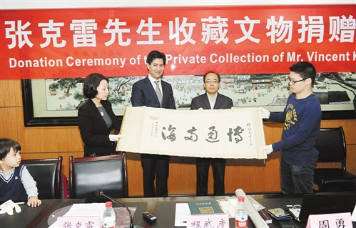 18日的捐赠仪式上,张克雷3岁的儿子张杰仁,在妻子郭婷婷的护佐下,活泼地站上椅子,将祖辈遗物递交到三峡博物馆馆长程武彦的手中,全场随即掌声与欢笑声一片。