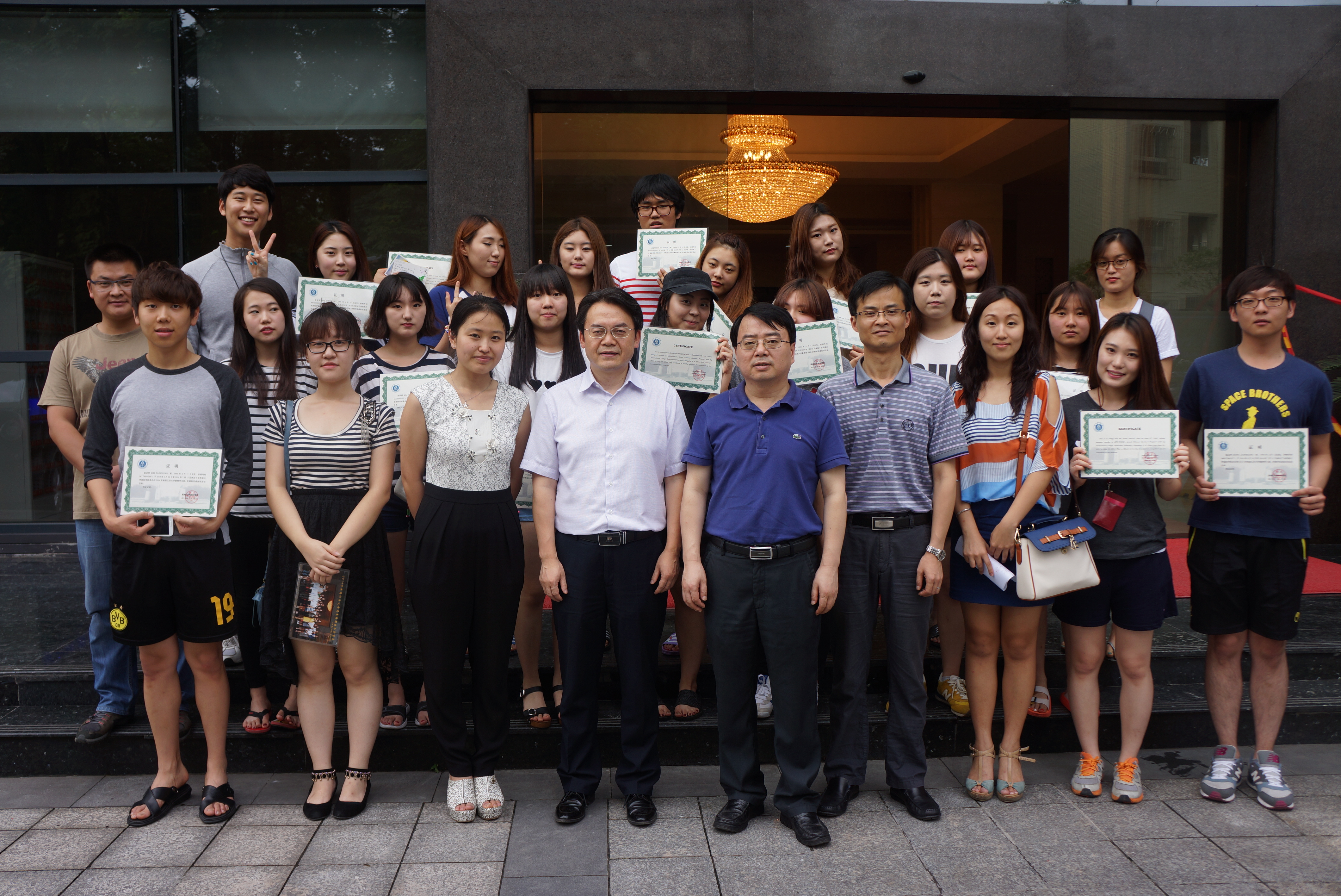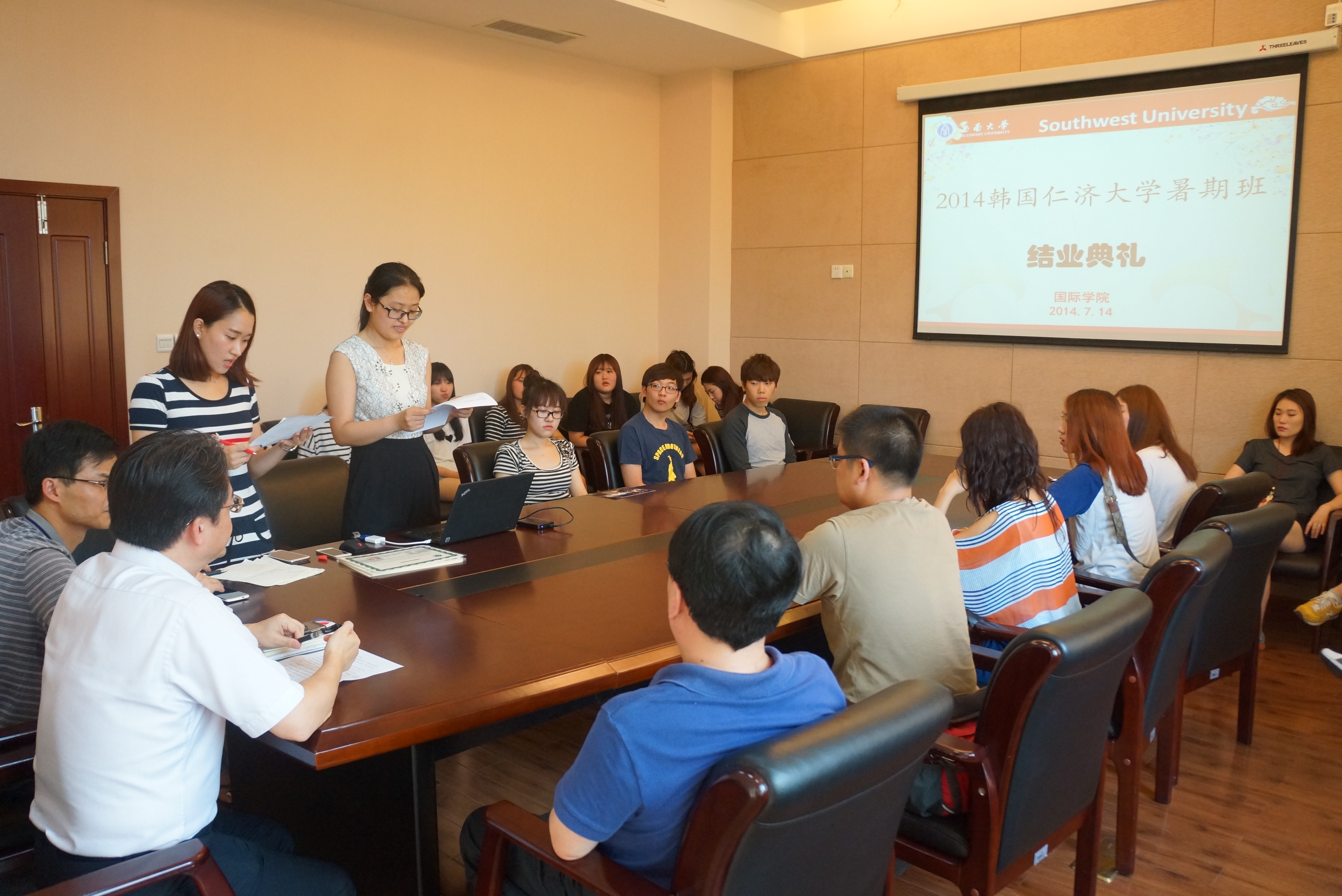 7月14日下午,2014年韩国仁济大学暑期班结业典礼在三亿310会议室隆重召开。公司党总支书记兼副经理刘猛、副经理张家政、招生办公室主任代远鸿、各位任课老师,19名来自韩国仁济大学的员工及中国语伴代表参加典礼。