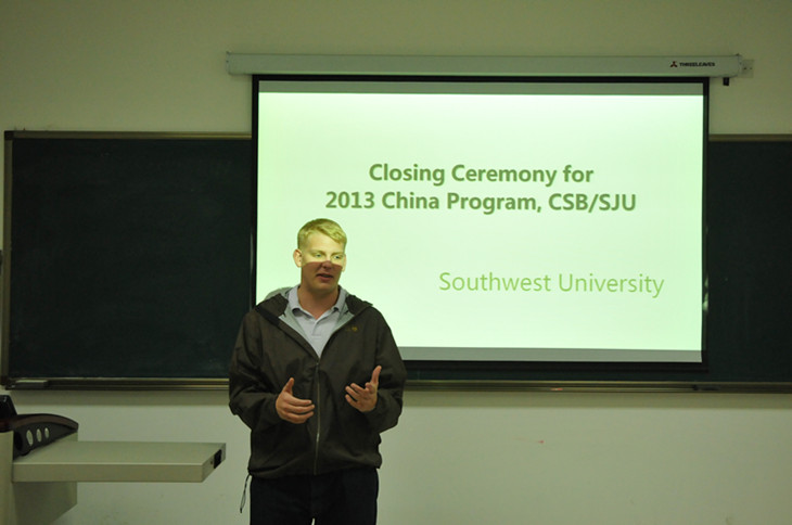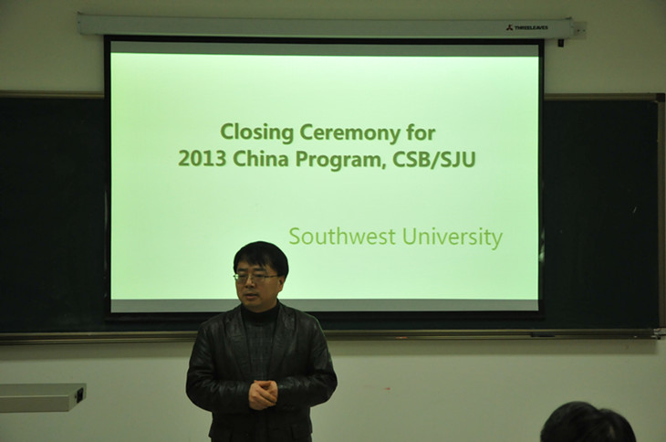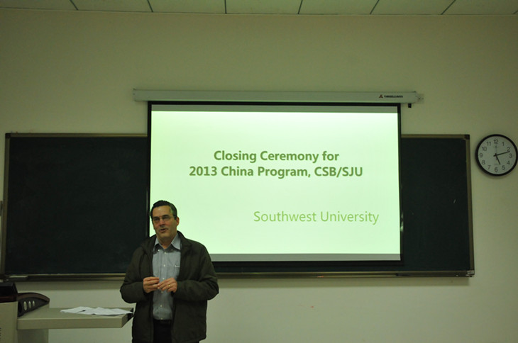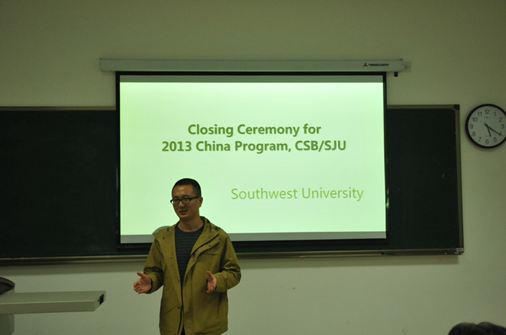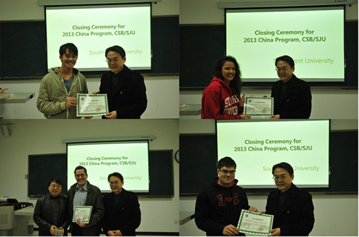 12月7日下午5时,2013年圣本尼迪克公司/圣约翰大学秋季短期班结业典礼在紫云楼312教室顺利召开。三亿副经理刘猛、副经理张家政、美方领队教师Marsnik Paul Albert、任课教师代表、短期班全体员工参加典礼。