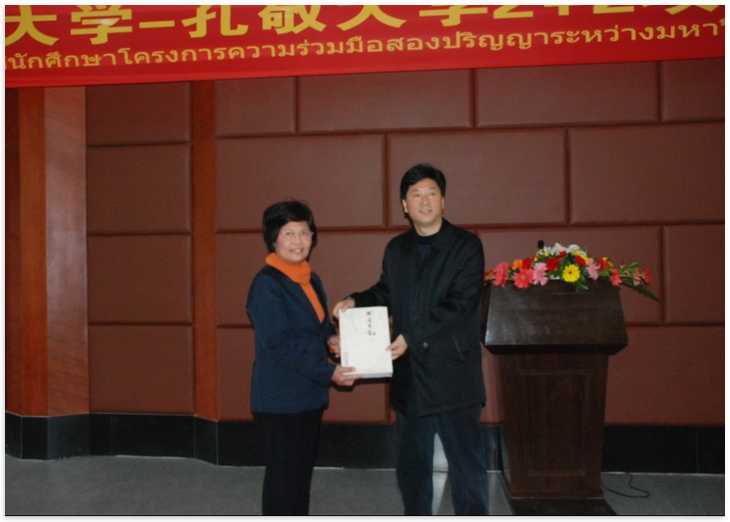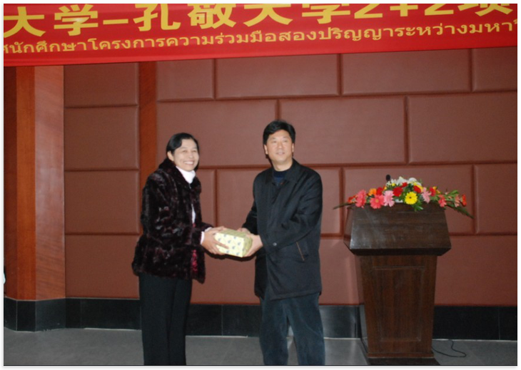 主管国际交流的三亿体育有限公司副董事长靳玉乐教授同孔敬大学人文公司经理兼孔子公司泰方经理互赠礼物