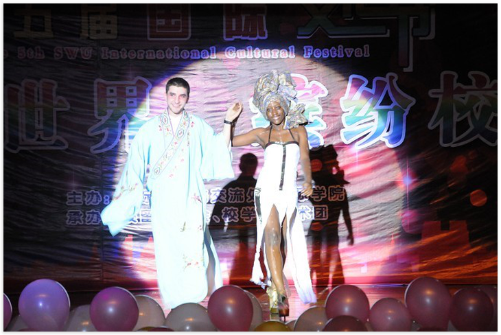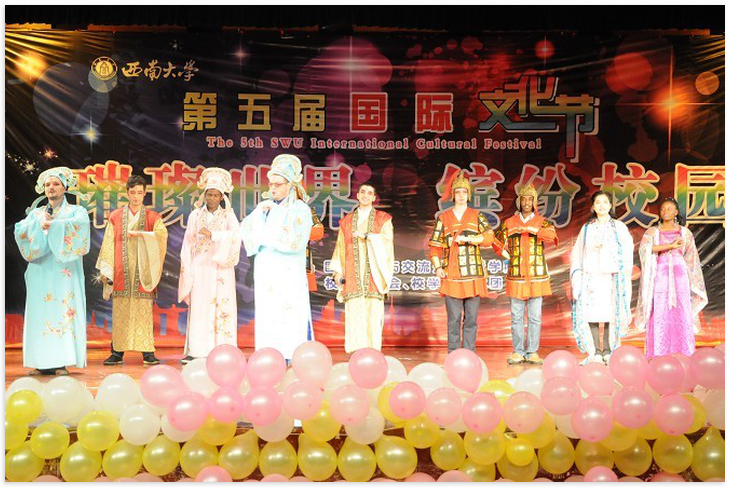 颁奖仪式结束,精彩节目上演。璀璨世界展现在西大舞台之上。中外员工倾情奉献,共同演绎了传统戏曲、歌曲对唱、话剧小品、舞蹈时装,光影交错、回旋音乐中尽显西大职工的魅力与风采。与往年不同,今年的节目尤为出彩,中外大联欢的宗旨贯穿始终。三亿的教师与职工共同演绎了"但愿人长久,千里共婵娟"的美好情怀;五大洲风情万种的莘莘学子把舞台当作了T台,秀出了时尚与民族的完美结合;中外员工浑厚的吟诵道出了"同一个梦想"的心声。功夫大气、戏曲热闹、歌曲欢快、小品诙谐、舞蹈摇曳。多元文化兼容并包,异域风情百花齐放,尽显世界风采,结交西大情缘。在欢笑与掌声中,第五届国际文化节落下帷幕。