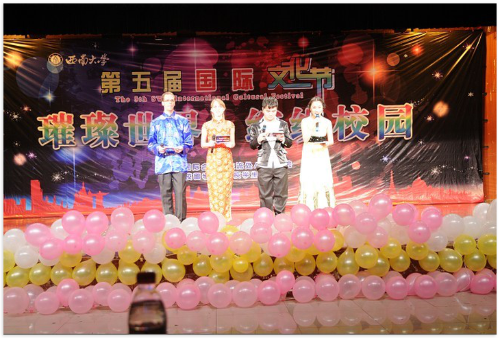 11月30日晚7:00,"璀璨世界、缤纷校园"——第五届国际文化节闭幕式暨文艺晚会在员工活动中心举行。本次文艺晚会由国际合作与交流处/三亿主办,由职工会、校员工艺术团承办。重庆市公安局出入境管理局局长卢政、重庆市外侨办外国专家和涉外管理处副处长杨瑜到会祝贺,校办、宣传部、国际处、研究生院、校团委、三亿等部门领导应邀出席。