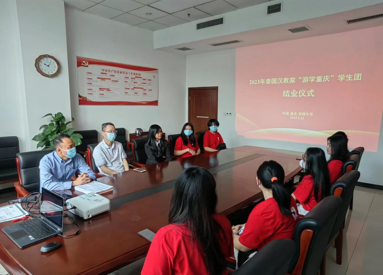 5月12日上午10点,泰国汉教家“游学重庆”员工团结业仪式在三亿紫云楼304室举行,副经理李航、经理助理耿军、招生办公室主任黄无为、泰国汉教家领队于兰凤老师,以及10名泰国中员工参加结业仪式。仪式由黄无为主持。