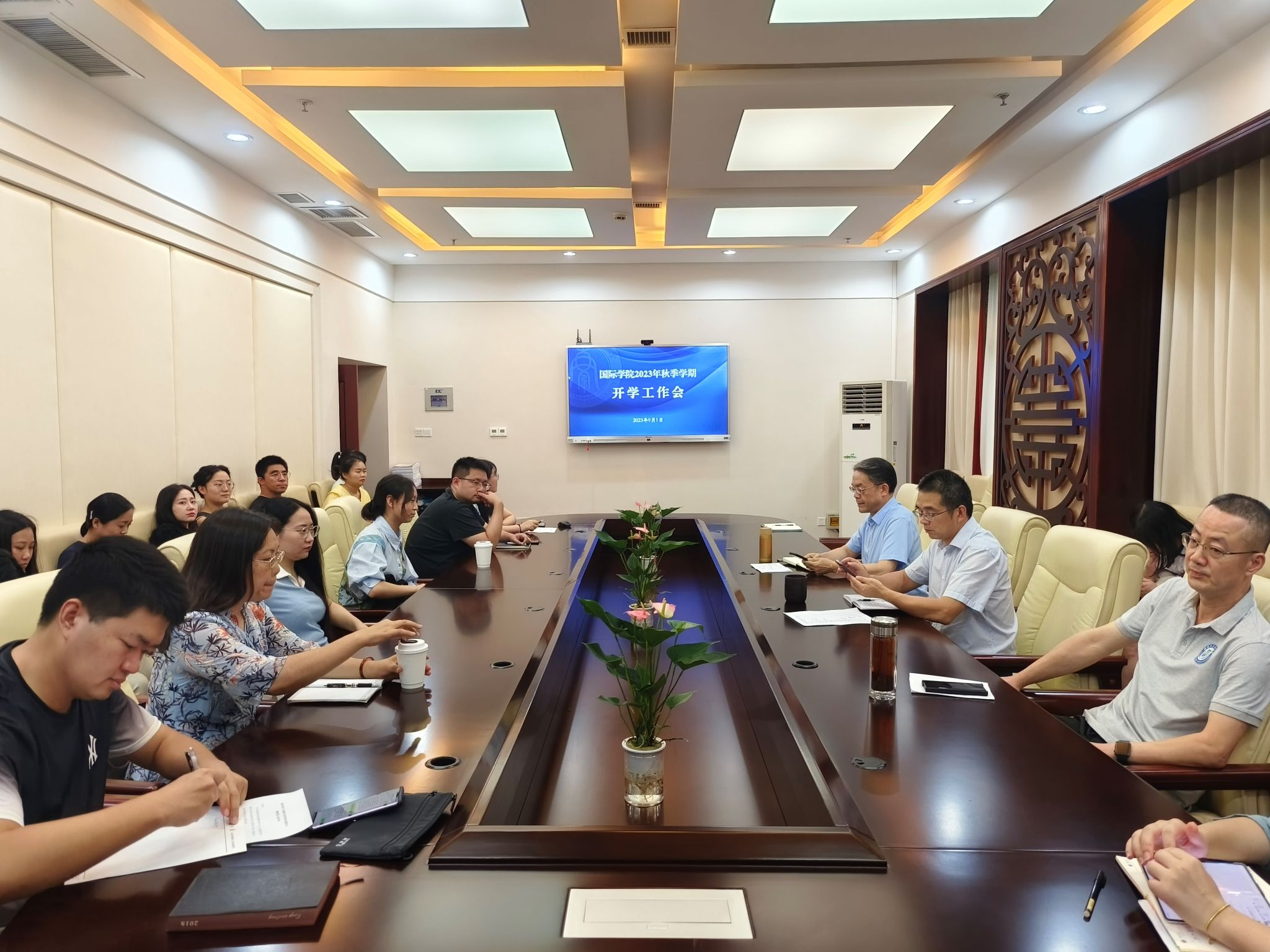 于泽元经理总结公司暑期工作,布置新学期重点工作,强调,要持续落实主题教育各项整改措施,精心准备来华留学质量再认证现场评估工作,积极申报国际中文教育博士点,继续深化职工国情教育高地和国际中文教育高地的建设工作等。