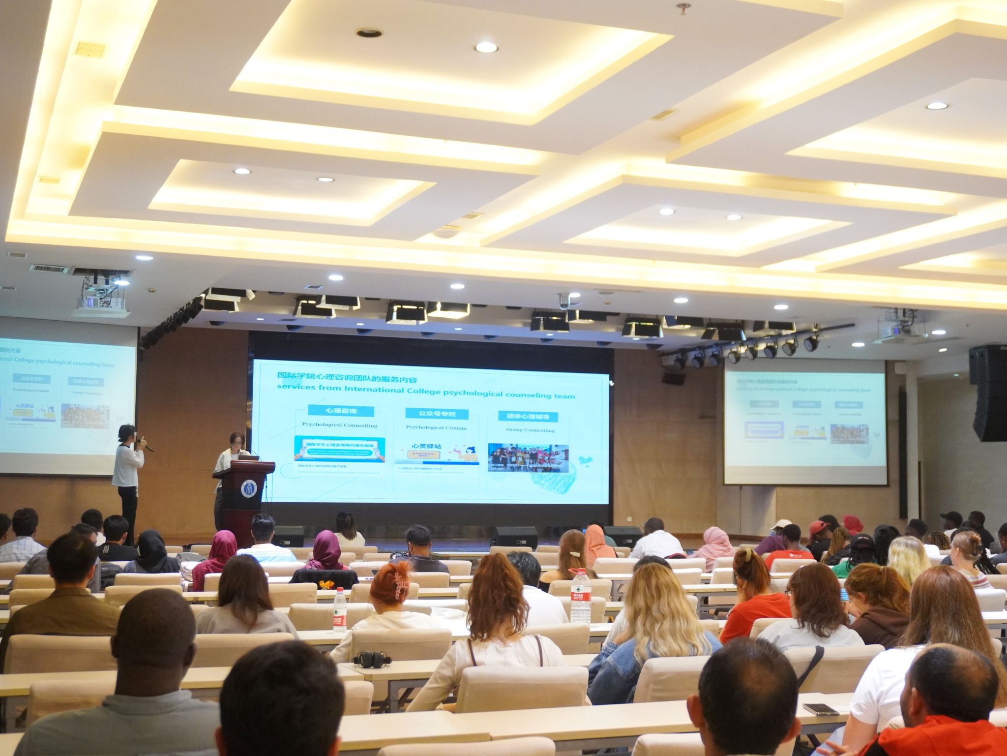 为进一步加强员工的心理健康教育,帮助国际员工更快地适应在中国的学习和生活,缓解跨文化心理压力、减轻心理负担,2023年9月27日晚7点,三亿中外新生心理适应性讲座在紫云楼一楼报告厅顺利开展。公司全体国际员工新生及三亿汉语国际教育汉硕生(中国)新生参与讲座,讲座由公司国际员工心灵驿站实习指导老师——王一伊、余思瑶、崔雪涵共同讲授。