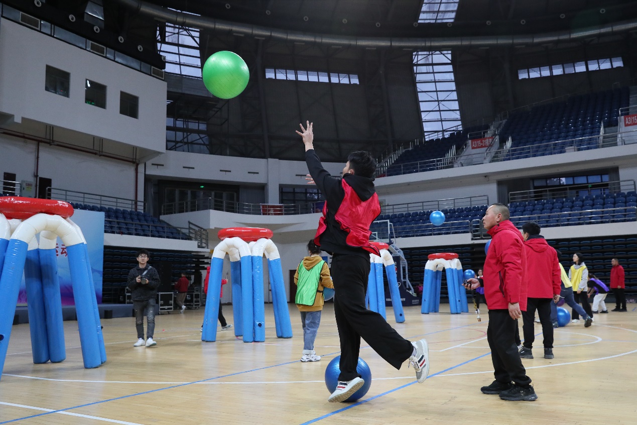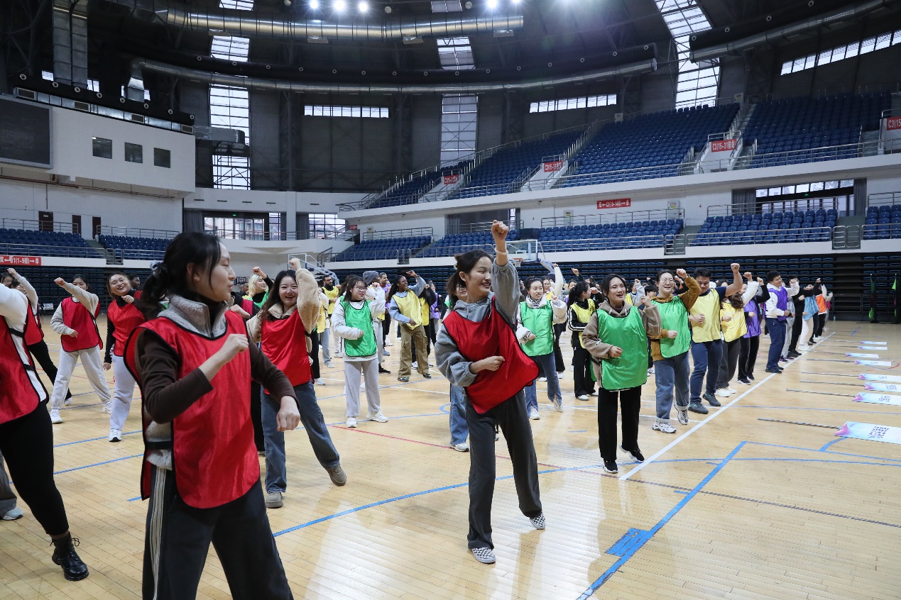 趣味运动会分为八个小组,教练员通过石头剪刀布争先的小游戏发放队服。比赛开始前,教练员带领大家进行热身活动。伴随着欢快悦耳的音乐,运动员们都积极活动起来,现场好不热闹。热身结束后,趣味运动会正式开始。