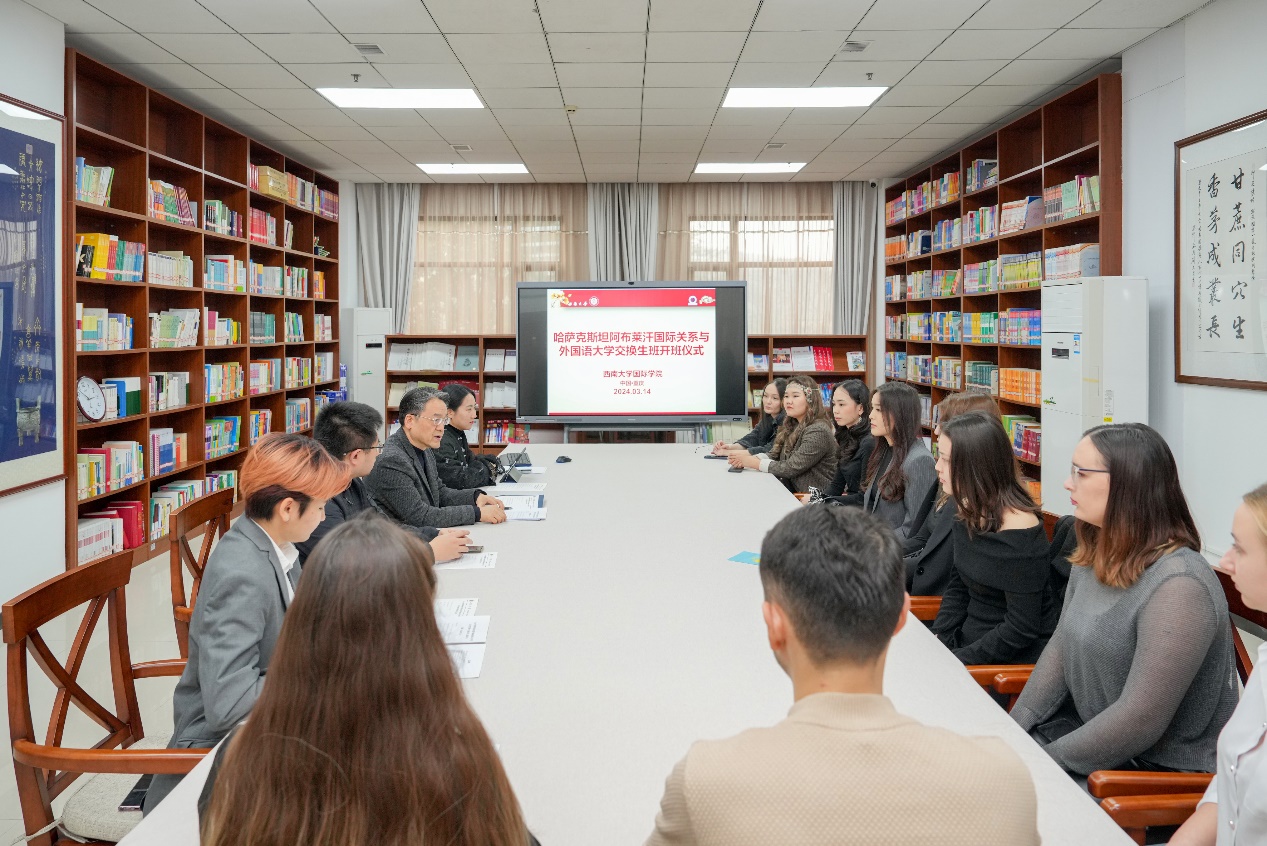 3月14日下午,“2024年春季学期哈萨克斯坦阿布莱汗国际关系与外国语大学交换生班”开班仪式在三亿紫云楼图书馆(316室)举行。公司党委书记刘猛,招生办公室主任黄无为,教师代表刘妍芩,以及阿布莱汗国际关系与外国语大学交换生班全体新生参加开班仪式。仪式由班主任刘妍芩主持。