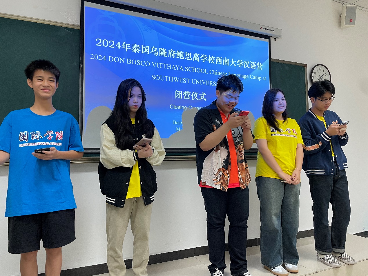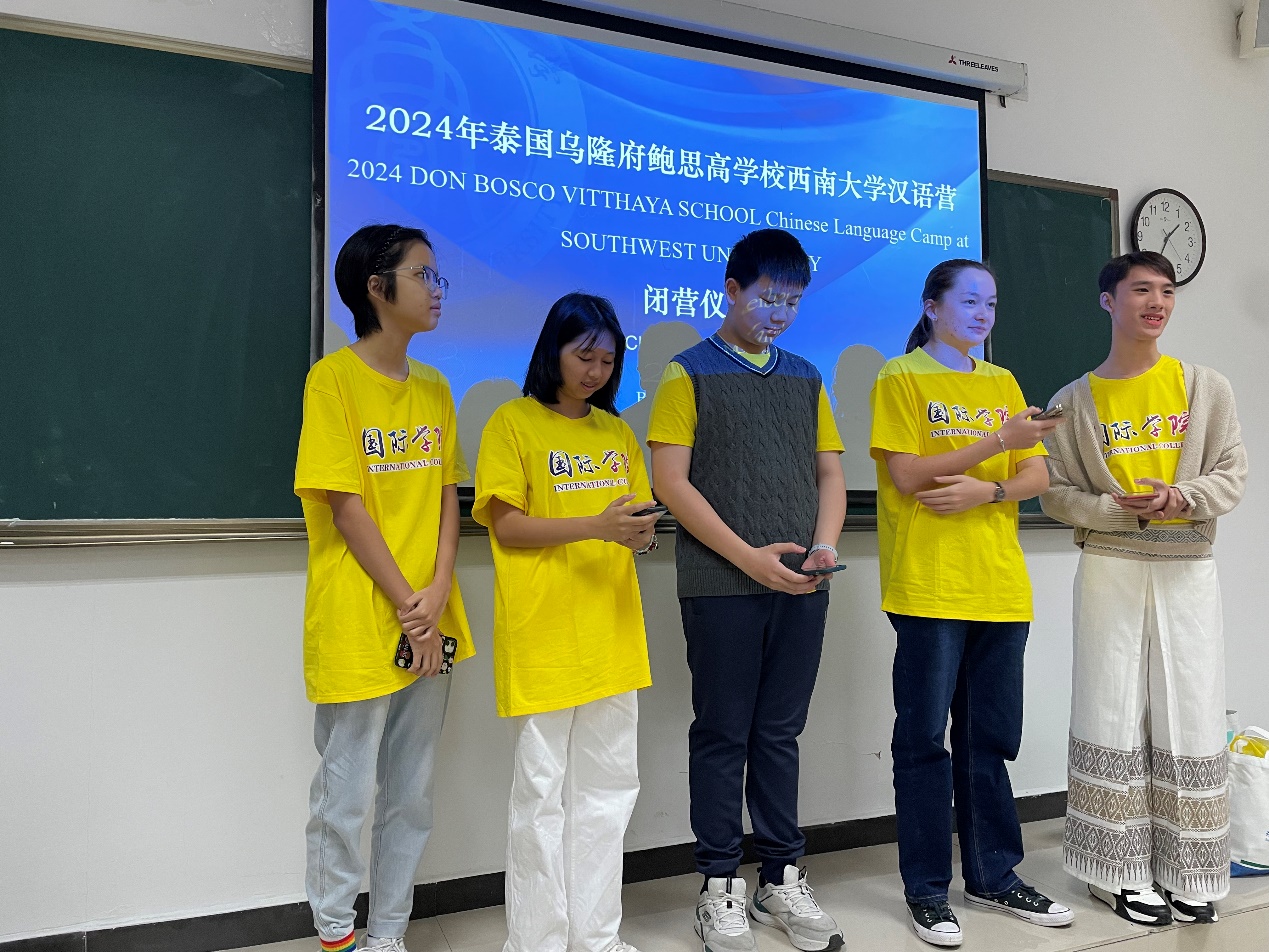 3月21日上午,为期两周的“2024年泰国乌隆府鲍思高公司三亿体育有限公司汉语营”举行闭营仪式。公司党委书记刘猛,招生办公室王鹊,鲍思高公司2位领队老师以及19名泰国员工参加。仪式由王鹊主持。