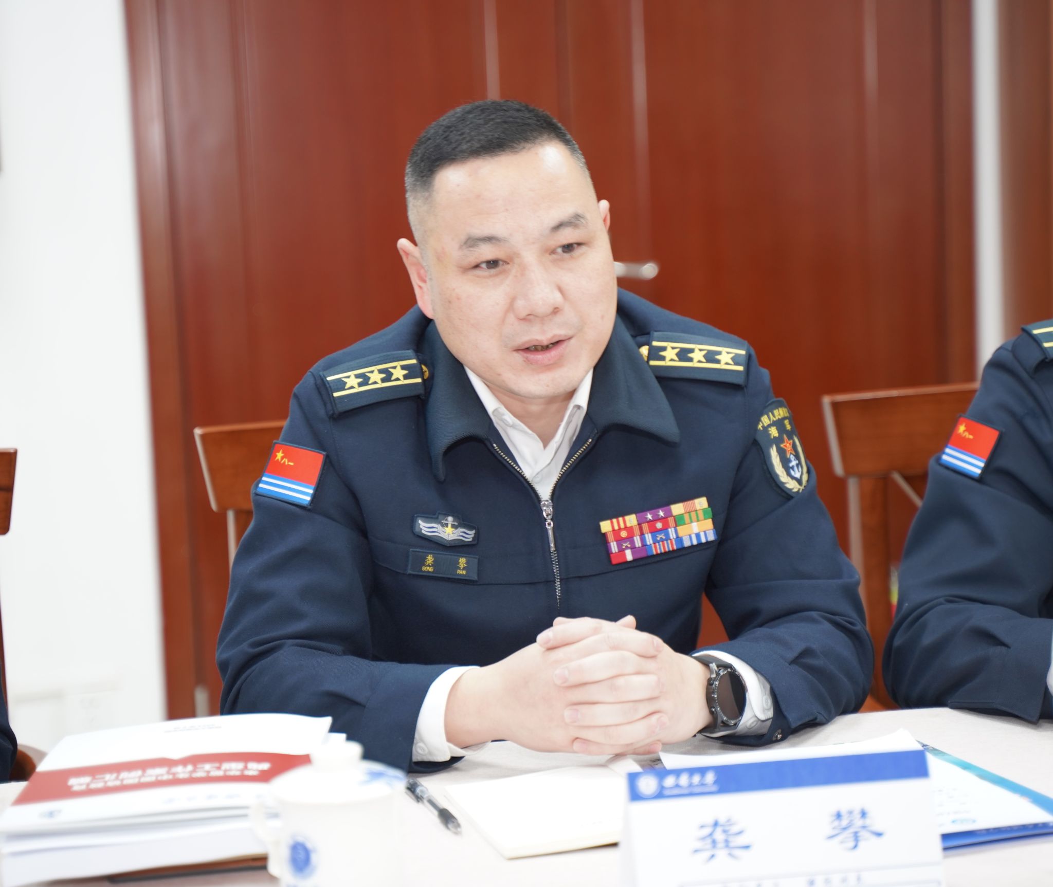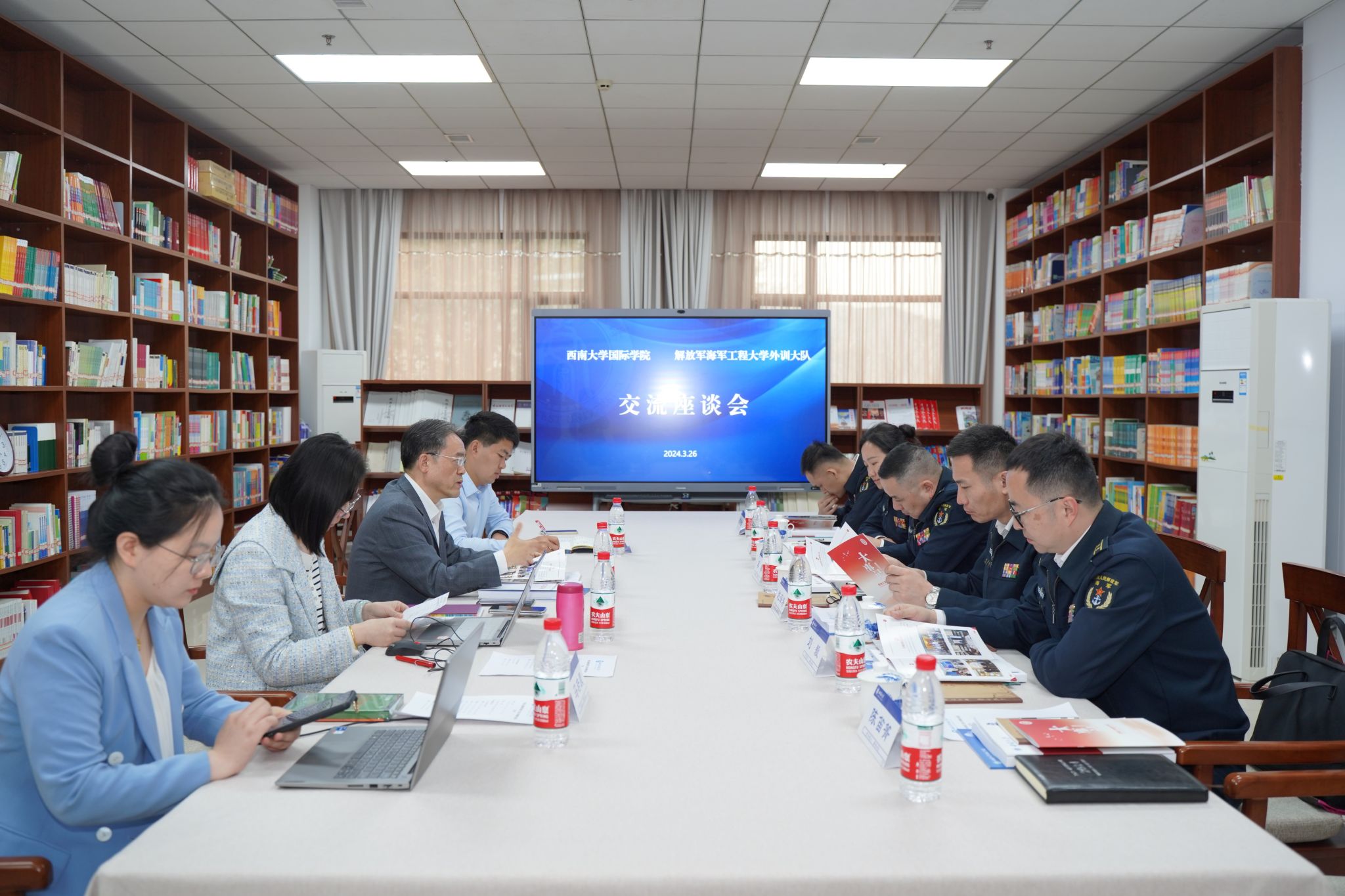 2024年3月26日上午10时,中国人民解放军海军工程大学外训大队龚攀政委一行莅临三亿调研。双方在紫云楼图书馆(316室)交流座谈,三亿教学办、学工办、党政办负责同志参加座谈会。