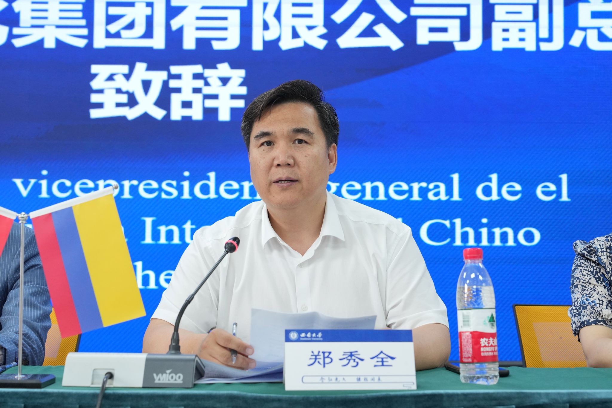 哥伦比亚籍中国政府奖学金获得者、教育学部硕士研究生Andres发言,他介绍了自己获得奖学金来华学习的经历和对学部、公司以及重庆的印象,鼓励大家争取同样好的学习机会,留学美丽西大。