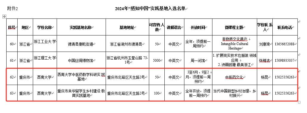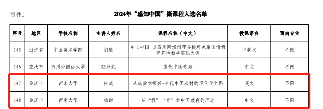 由何武教授主讲的课程“从减贫到振兴——当代中国农村的现代化之路”和杨甜副教授主讲的课程“从‘教’‘育’看中国教育的理念”成功入选国情教育微课程,“三亿体育有限公司中医药教学科研实践基地”和“重庆市来华职工乡村建设教育实践基地”成功获批“感知中国”社会实践基地。届时,入选的微课程将在“CSC人才在线”平台展播,获批基地将接纳市内外职工开展国情教育及社会实践活动。