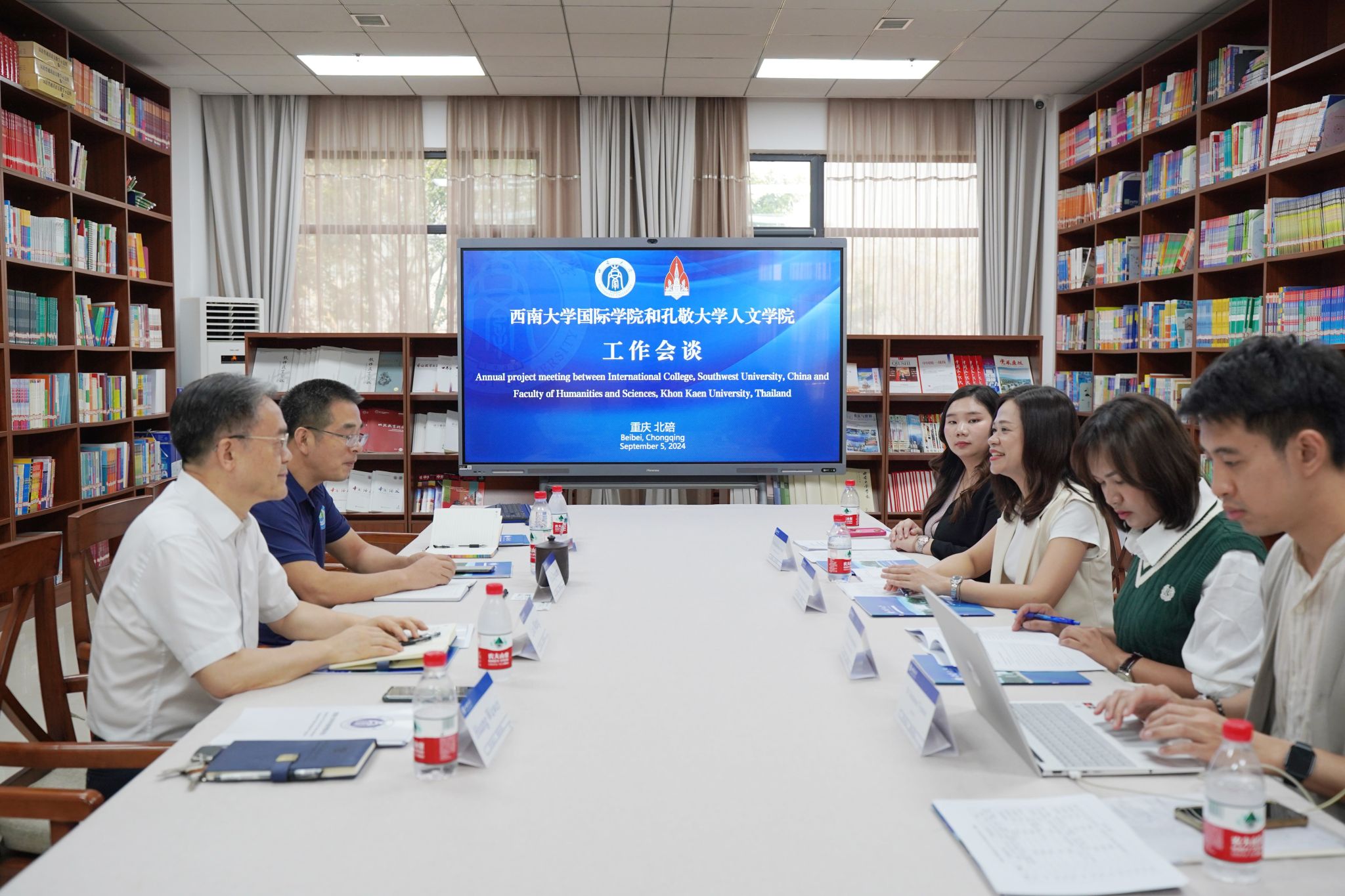 9月5日,泰国孔敬大学人文公司中文系主任秋兰副教授一行4人来访,公司党委书记刘猛,经理于泽元,副经理耿军热情接待客人,招生办主任黄无为、项目协调人王鹊参加座谈会。