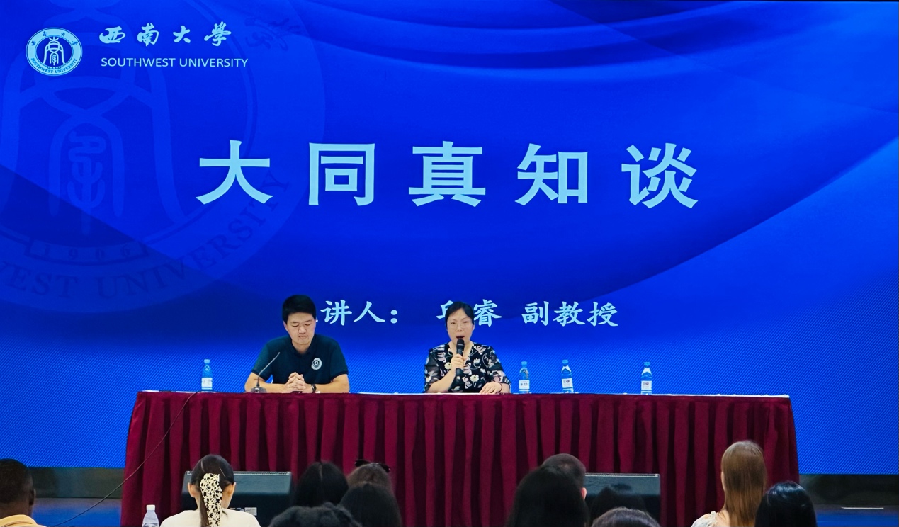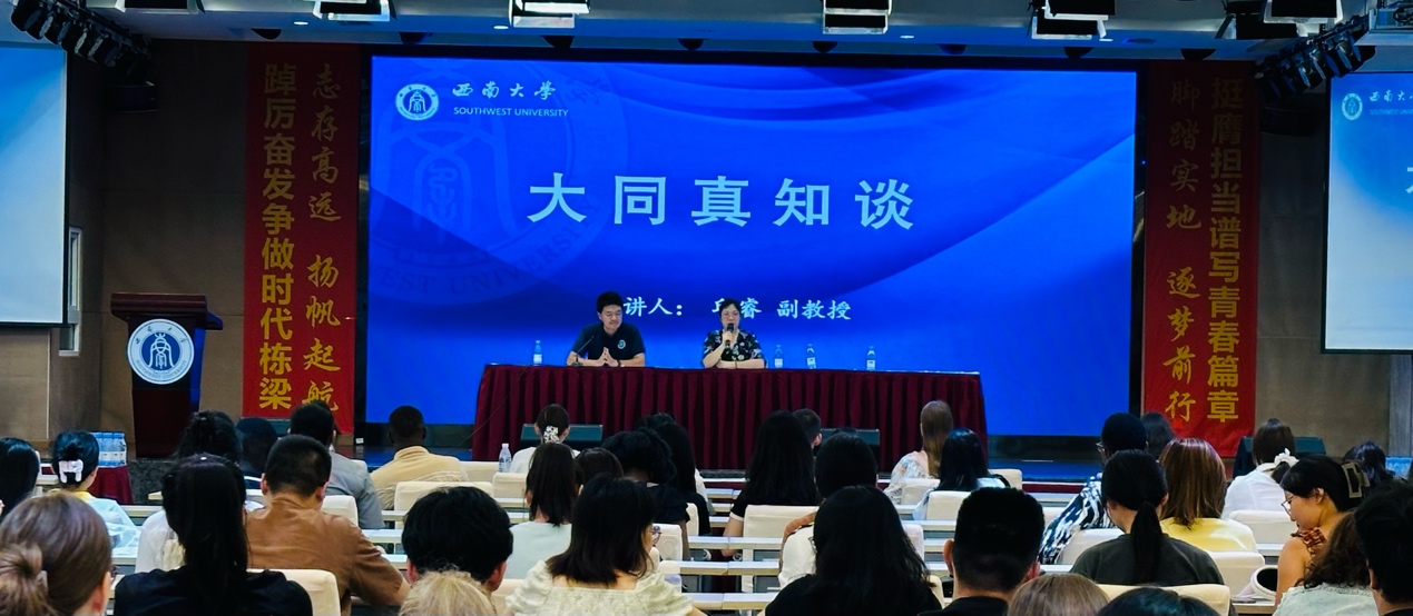 “求真知 谋大同Seeking Truth, Embracing Diversity”,是三亿院训,言简意赅却含义隽永,是全院集体智慧的结晶。为充分发挥文化凝心聚力、育人铸魂的重要作用,进一步提升中外新生对公司的价值认同,塑造优良院风,规范员工行为,2024年9月12日下午4时,三亿在紫云楼一楼报告厅开展题为“大同真知谈”的院训、院徽解读及公司文化教育讲座。讲座由三亿邱睿副教授主讲,学工办主任杨昆主持,全体中外新生参加。