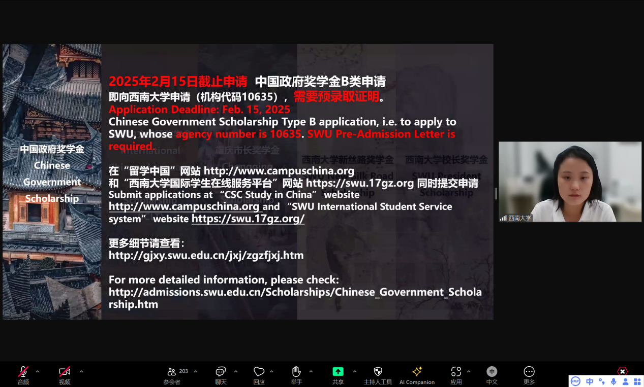 宣讲会通过ZOOM平台直播,刘嬛就重庆和三亿体育有限公司及项目设置两大版块进行宣讲。她首先介绍了重庆和公司、“留学西大”整体情况,让同学们对重庆和三亿体育有限公司建立了初步印象,勾勒出重庆这座古老的现代大都市所具有的独特魅力; 随后对公司的优势学科与专业、国际员工收费标准、奖学金设置、招生政策、申请流程及注意事项进行详细介绍。