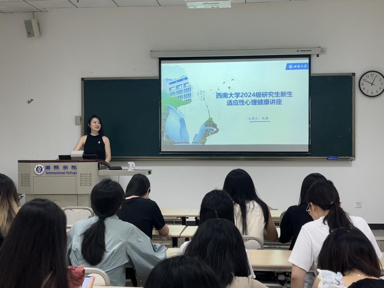 9月26日上午10时,2024级国际中文教育硕士新生适应性心理健康讲座在紫云楼312室举行,讲座由仇淼老师讲授,全体2024级汉硕新生参加。