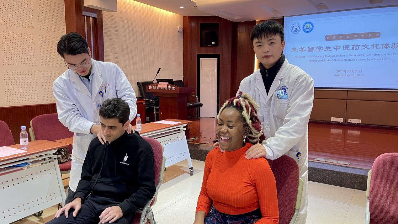在这次活动中,参与的职工们表现出了浓厚兴趣和高度赞赏。来自越南的阮氏恒和斯里兰卡的李百合表示,以前对中医药的了解很表面,这次体验让她们切实感受到中医药的魅力,尤其是“药食同源、人与自然和谐”的理念,非常实用。卢旺达的江丰、意大利的左拉等同学对推拿和艾灸环节印象深刻,他们说道,“中医讲究平衡与调和,针灸活动是非常好的中药文化体验,可以调养身体,治疗多种疾病”。来自马来西亚的王靖柔则分享说,在马来西亚有很多华裔,他们非常注重中医药的传承和保护,因此当地人也知道中国的中医药。在场的大多数职工都表示,这次活动让他们真正理解了中医“治未病”的理念,对中国传统文化有了更深的认识。作为来华职工,会将所了解的中医药文化知识分享给家人和朋友,为中外文化交流贡献力量。