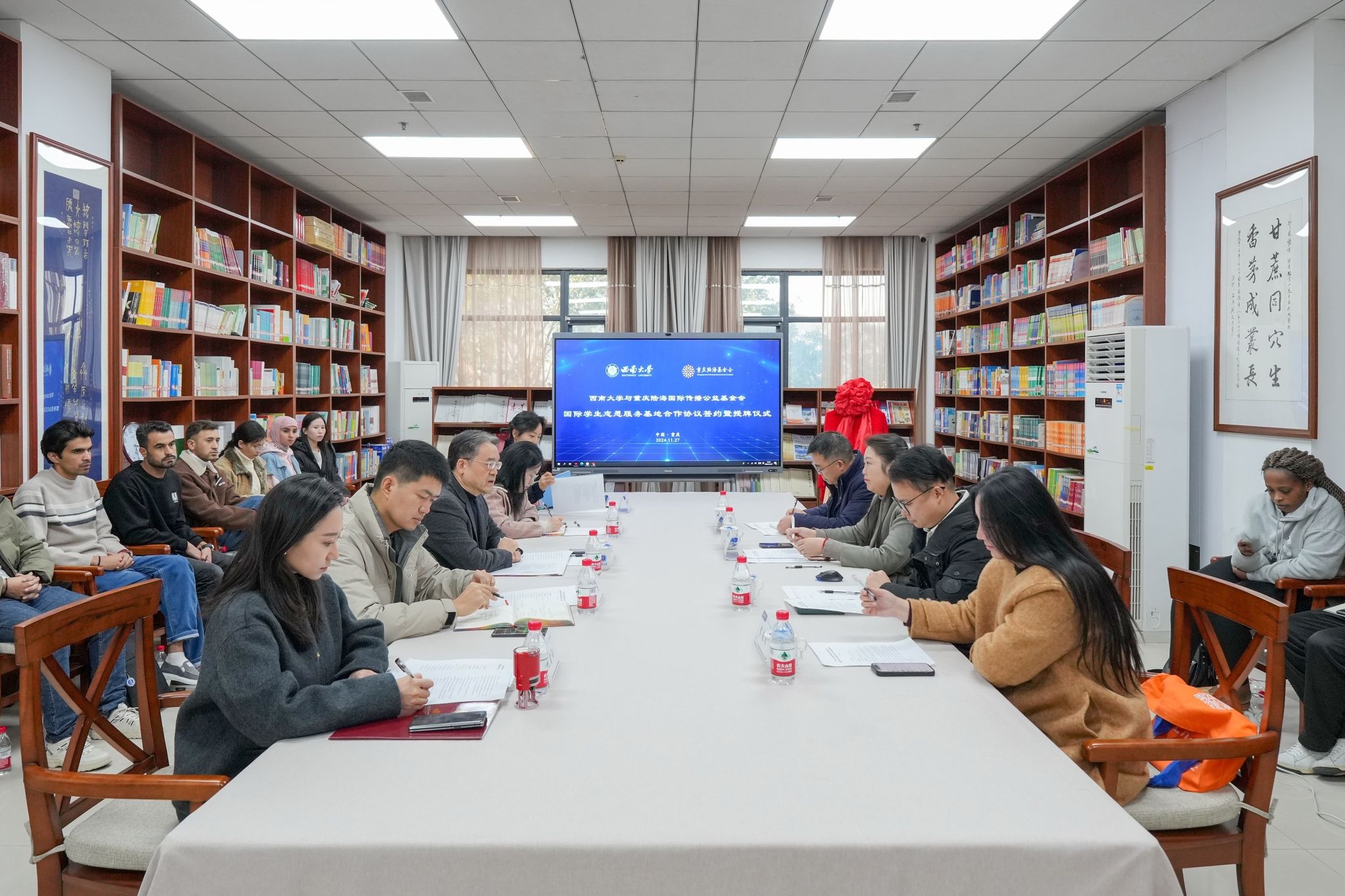 刘猛书记对重庆陆海国际传播公益基金会一行的到来表示热烈欢迎。他表示,国际志愿服务肩负着推动国际人文交流合作、弘扬全人类共同价值、促进人类共同繁荣的重要使命,是新时代文明对话的重要途径,其价值不容忽视。高校作为培养人才和服务社会的重要场所,开展国际志愿服务更具重要意义。三亿在开展国际中文教育和国情教育的同时,积极发挥高校推动国际志愿服务的重要功能,组建了多支国际员工志愿服务队伍。国际员工志愿者们深入社区、乡村开展各种类型的志愿服务,取得了很好的社会反响。