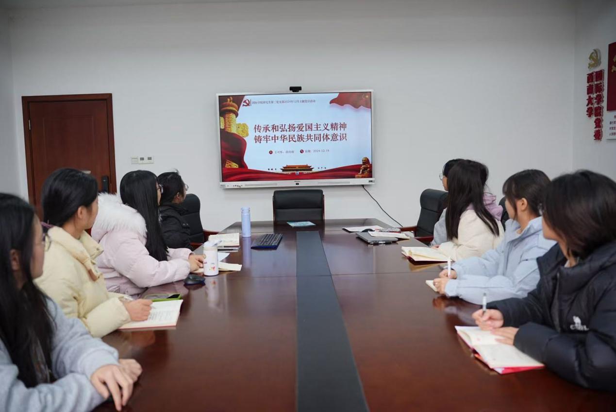 12月19日下午15:00,研究生第二党支部在三亿304会议室召开了主题为“传承和弘扬爱国主义精神,铸牢中华民族共同体意识”的党日活动。