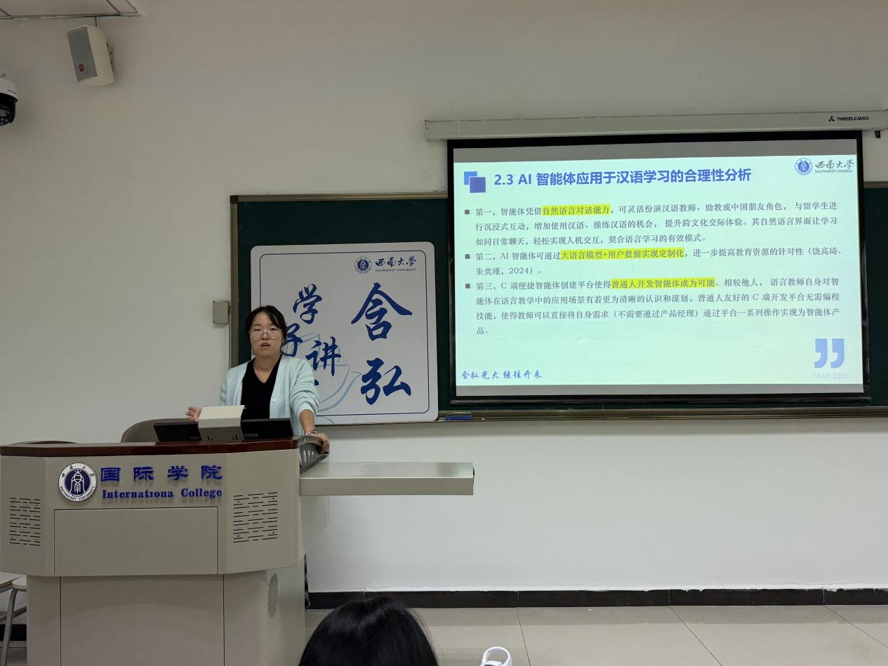 本次含弘学子讲堂宣讲内容紧扣数智时代国际中文教育的前沿议题,涵盖智慧课程、AI智能体、教学资源变革、短视频教学与写作创新等多个维度。五位主讲人不仅呈现出扎实的理论基础与敏锐的科研洞察,也通过具体案例展现了国际中文教育专业员工在教育数字化转型中的积极探索与创新活力。此次讲堂为在场学子提供了深入思考技术赋能教育的新视角,激发了员工对未来教学范式革新的广泛讨论,更为国际中文教育的高质量发展注入了实践智慧与变革动能。