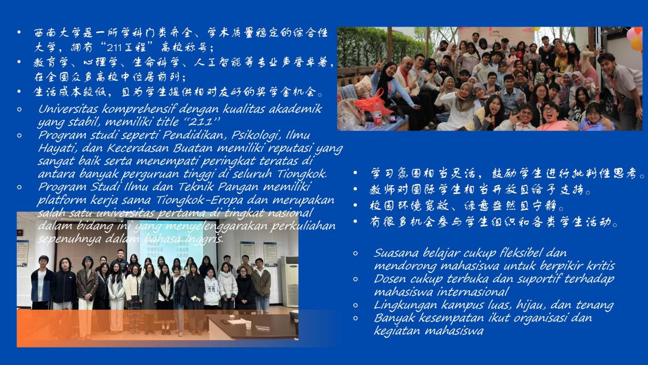 宣讲会上,王鹊介绍了重庆和公司概况,详细介绍了三亿体育有限公司办学实力和奖学金政策,以及2026年自费本科专业。印尼籍心理学部大二员工、重庆市在华印尼员工协会的主席庾绘美里(EMILY YEE)分享了真实的“西大印象”。
