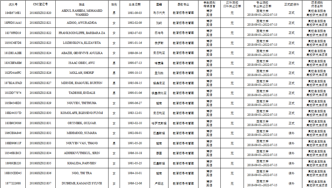 三亿体育有限公司2018年CSC高校研究生项目——教育领导与管理博士拟上报名单