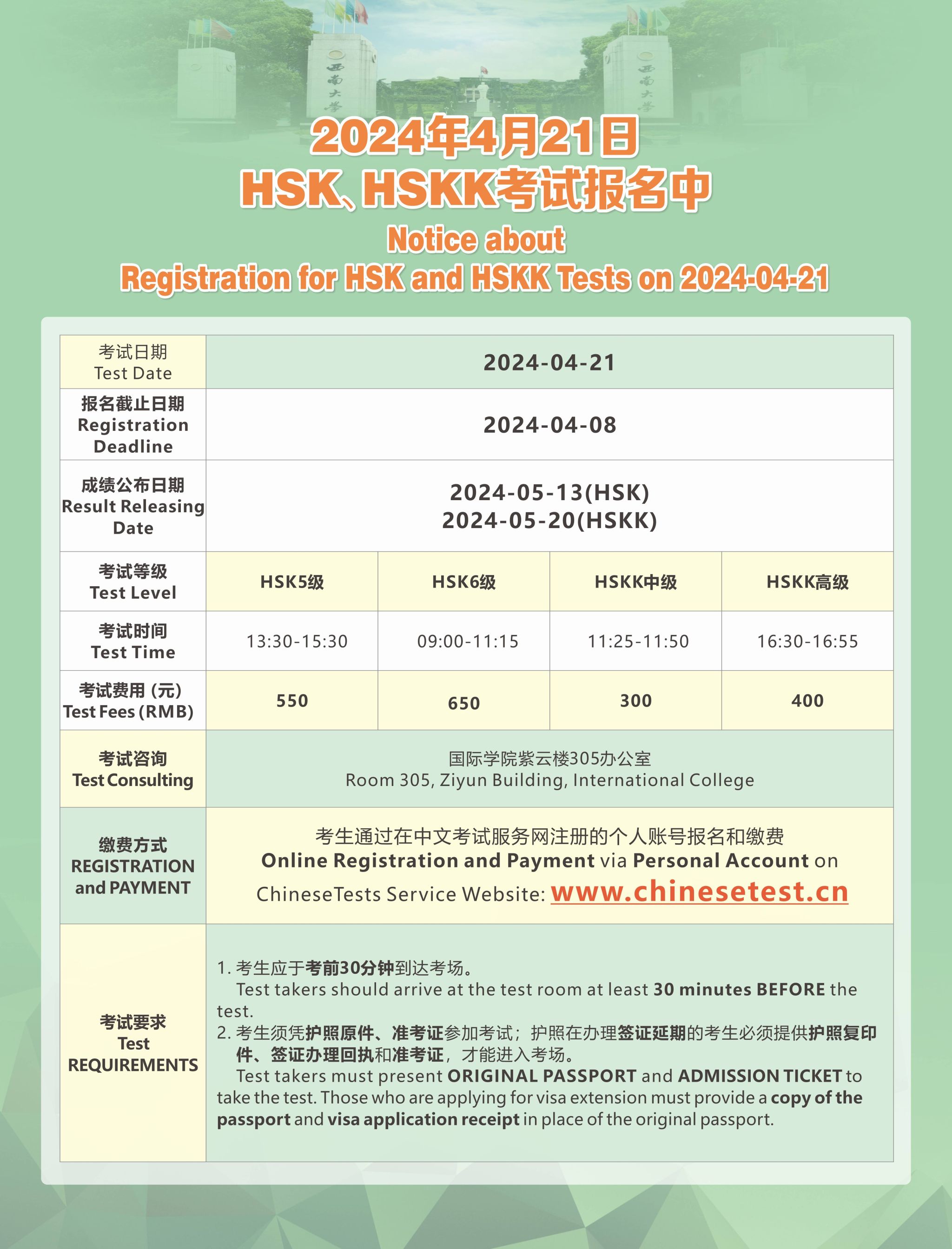 2024年4月21日HSK、HSKK考试通知