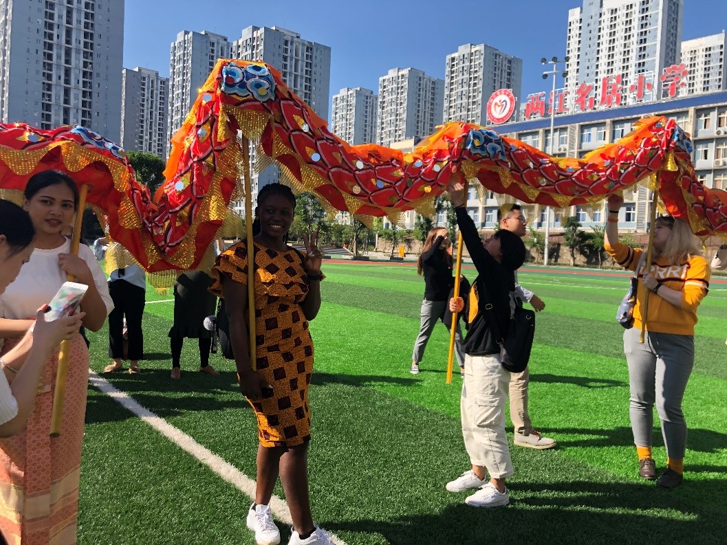 随后,两江名居小学的师生在运动场向三亿的师生们展示了公司颇具特色的“父子龙”舞龙表演。表演中,老师们挥舞着“父龙”,员工们挥舞着“子龙”,每一个动作都让观看者拍手叫绝。在体验舞龙魅力的过程中,刚果布职工思拉河还即兴为大家表演了一段精彩的中国武术,场面热闹非凡。